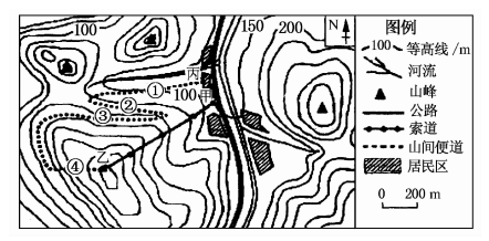 D.山间便道①、②、③、④四处中①处坡度最大
