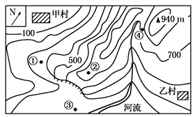 【小题2】由图中①②③④四个地方的甲村、乙村连起来,从①点看得到甲村,从①看乙村时中间有山脊挡住了视线,故A错;从②看甲乙村时中间无高大障碍物挡住,故B对;从③看甲村时中间有高大陡崖挡住,故C错;从④看甲村时中间经过了山顶,挡住了视线,故D错。