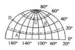 2、综合题 读“经纬网示意图”,完成下列各题。(8分)