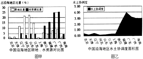 5、综合题 27. 读我国东部沿海土地利用结构变动表及中国沿海地区耕地、水资源对比图(图甲),中国沿海地区水土协调度面积图(图乙),分析回答问题。(8分)