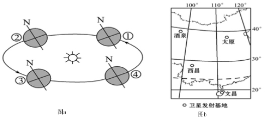 1.当“神舟八号”飞船发射升空时,地球在公转轨道上的位置最接近图a中的2.图b所示的我国四个卫星发射基地中,使用同样燃料,火箭发射速度最快的基地是