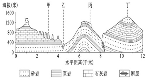 2.甲地为峰林,乙处为河谷,乙处为外力侵蚀作用最强烈,丙处坡度大易发生滑坡现象,丁处是典型的向斜山。