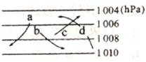 本题解析:试题分析:水平气压梯度力是形成风的原动力,始终垂直于等压线,由高压指向低压,近地面的风还受到地转偏向力和摩擦力作用,最终风向与等压线斜交,且南半球地转偏向力向左偏。故选d箭头。