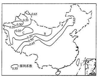 2、单选题 由于气候变异和人为活动引起的湿润系数在0.05~0.65范围内的地区土地退化过程称为荒漠化。而土地退化是指包括侵蚀、盐碱化、肥力衰竭在内的土壤退化过程和包括植被覆盖度降低、生物量减少和生物多样性下降等在内的生态系统退化过程。读图,回答以下各题: