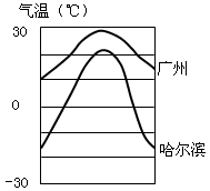 (2)简述广州与哈尔滨的气温差异。(2分)