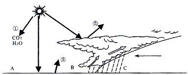 本题解析:小题1:大气直接吸收的太阳辐射很少,它主要靠吸收地面长波辐射而增温,应为④。