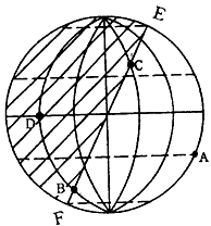 2、综合题 读“太阳光照图”(阴影表示黑夜,非阴影表示白天)(如图),且此半球是东半球。回答下列问题。