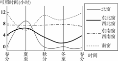 1、单选题 下图是30°N地区几种朝向的窗户内每天可能受到阳光直接照射的时间曲线图,该地区住户的下列朝向能使室内冬暖夏凉的是