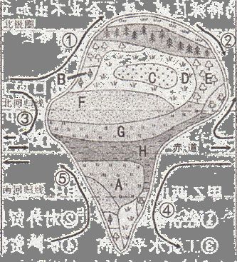 2.此题首先要记住自然带的名称,其次是要掌握自然带的分布规律。图中H为热带雨林带,A、G是热带草原带,F是热带荒漠带,从F—G—H的地域分异规律以热量为基础的纬度地带性(从赤道向两极)的地域分异规律。B处是亚热带常绿硬叶林带,C处为温带荒漠带,D处是温带草原带,E处是温带落叶阔叶林带,从C—D—E自然环境的变化体现了从沿海到内陆的地域分异规律;C 和F两处都是荒漠带,但成因不同,C处是由于深于内陆,距海远,降水少而形成温带荒漠带,F处是由于受副热带高压带或信风带控制形成的热带荒漠带。