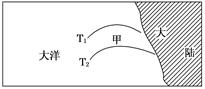 2、单选题 该图为某沿海地区,图中T1、T2为甲洋流流经区域等温线的分布状况。读图回答