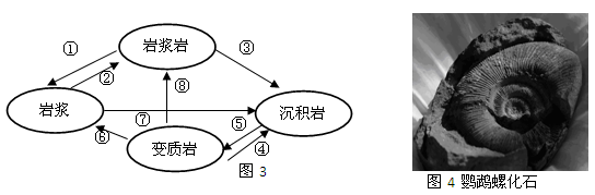 4、单选题 读“某学生画的岩石圈物质循环示意图(图3)”和“喜马拉雅山某处化石照片”(图4),完成下题。