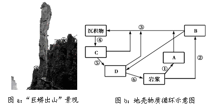 【小题1】根据地壳物质循环的过程及岩浆、岩浆岩、沉积岩、变质岩四者的关系可知A是岩浆岩中的侵入岩,B是岩浆岩中的喷出岩,C是沉积岩、D是变质岩;由题可知巨蟒出山风景的岩石是花岗岩石柱,花岗岩属于岩浆岩中的侵入岩,故选项A正确。