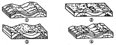 1、单选题 在地质年代校老的柑垃构透地区常出现背斜成谷、向斜成山的“地形倒置”现象。图为地形倒置形成过程示意圈,完成各题。