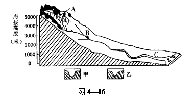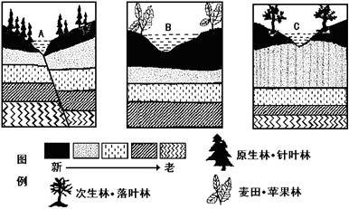 2、综合题 图中河流是在自然条件下形成的,A、B、C分别表示不同河段上的三个点,下图是根据三处的横截面状况绘制了下面的剖面图。分析后回答。