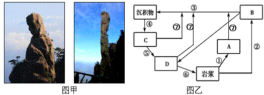 1、单选题 “东方女神”、“巨蟒出山”(图甲)是江西三清山标志性景观,该景观为花岗岩山岳地貌。图乙为“地壳物质循环示意图”,读图完成各题。
