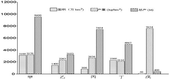 小题2:甲是中国,单产较高是集约化生产,A错;中国人口众多,我均产量低,B错;中国粮食主要是自给,C错;中国小麦生产主要分布在东部季风区的平原和盆地。选D正确。