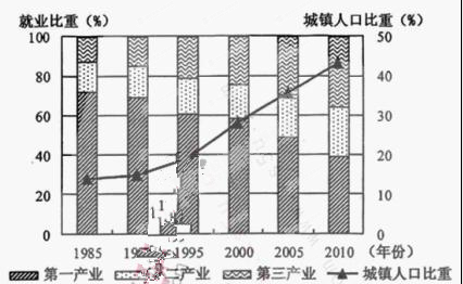 1、单选题 下图表示安徽省1985-2010年就业结构与城镇人口比重变化。完成下列各题。