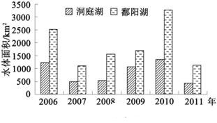 3、单选题 图是2006~2011年各年5月中下旬长江中游洞庭湖和鄱阳湖水体面积变化对比图。 读图回答题。