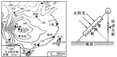 (4)某校(40°N)一研究性学习小组对本地的太阳能热水器进行调查后,发现热水器的倾斜角度是一个固定值,他们提出一个改进方案,将图中的支撑杆设计成可调节的活动杆。你认为改进的理由是_____________。(2分)