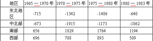 小题1:由表格中数据可以判断,70年代东北部地区迁出人口多于迁入人口;70年代以后,南部地区一直是人口迁入地区;80年代以后,东北部地区人口迁出变少;80年代以后,迁往“阳光地带”(西部和南部)的人口数量明显减少。