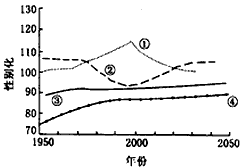 4、单选题 ? 人口的性别结构是指一个国家或地区两性人口数量的比例关系,它通常由性别比这个指标加以度量,性别比为平均每100名女性所对应的男性人口的数量,下图为四条人口性别比例曲线,回答1—2题。
