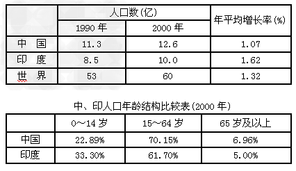 1、综合题 读下列有关中国、印度的人口资料,回答问题。
