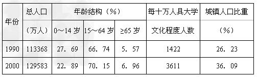 2、单选题 下表为我国大陆地区1990年第四次和2000年第五次人口普查数据。分析回答1~2题。