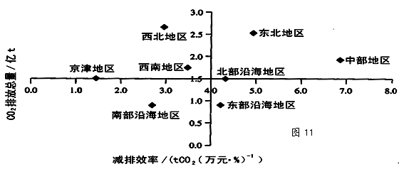 4、单选题 图11为“我国区域产业CO2减排效果比较示意图”,完成问题。
