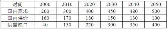 材料二?国际经验表明,当一国的石油年进口量超过50Mt时,国际市场行情的变化就会影响这个国家的经济运行;超过100Mt,该国家就应该采取有力措施,来保证能源安全。中国石油中长期供需平衡表?单位:Mt(百万吨)