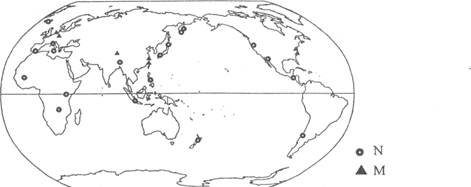 小题2:从图中可以看出,能源N主要分布在环太平洋地区和地中海-喜马拉雅地震带,东非大裂谷一带也有分布。可以推断出,N应该是地热能,和板块运动有关,我国地热资源主要在西南地区。选择A。