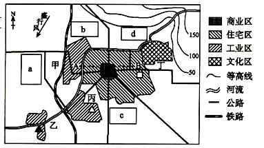 (3) 选d(2分)?靠近文化区(1分);地势较高(1分);空气清新,环境优美(1分);噪音污染少(1分);靠近河流,且在河流上游方向(1分)。言之有理,酌情给分。