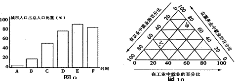 1、单选题 读图9某城市人口占总人口比重变化图和图10劳动力在各行业中的百分比图,回答题。