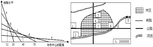 (1)图中a—e表示小麦种植业、花卉与乳牛业、工业、商业、住宅用地付租能力随距离递减的情况,请将字母填入表中。(8分)