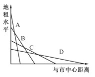 2、单选题 下图是商业、工业、居民和农业等四种活动的付租水平随距离递减示意图,回答1—2题。