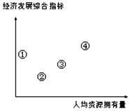 2、单选题 读图(美国、日本、巴西、印度四国经济发展综合指标与人均资源拥有量示意图),回答问题。