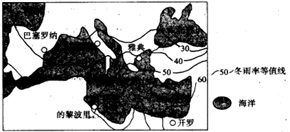 4、单选题 读地中海地区冬雨率等值线图,回答下列各题。