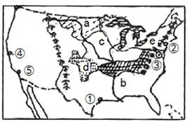 小题1:结合美国农业专门化生产地带的分布判断,ad为美国中央大平原中部和北部的小麦带,c为玉米带,都属于商品谷物农业地带;b表示密西西比河下游的棉花带;e表示五大湖周围的乳畜带。