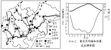 (2)根据材料二,指出甲城市浓雾出现的主要季节,并分析该季节浓雾形成的主要原因。(8分)