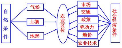 1.影响农业的主要自然区位因素有气候、土壤、地形。如下图所示: