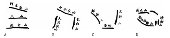 1、单选题 我国的地形复杂多样、山区面积广大,尤其是纵横交错的山脉,构成了地形的骨架,高原、平原、盆地和丘陵镶嵌其间。下图中表示黄土高原的是
