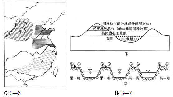 (3)图3—7中①②两种农业发展模式,分别适合于图3—6中的甲、乙、丙哪个地区?
