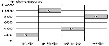 小题3:B地降水量只有200mm,属于热带干旱地区,不容易发生洪涝灾害。C地进行大水漫灌会形成盐碱地。D地属于降水较多,并且是中温带,蒸发较少,不易发生荒漠化。