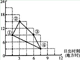 3、单选题 下图反映的是四个不同地点2009年6月22日的日出时刻与日照时数之间的关系。回答1—3题。