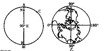 1、综合题 (8分)下图中甲图所示范围全部为昼半球,N点为北极点,B点为90°E经线与南极圈的交点,读图,完成下列各题。