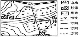 2、综合题 下图是某规划区的示意图。在规划中要确定一条公路干道。已知客货流收发点是火车站、县城和乡镇。一般来说,干线的走向要根据主要经济据点的分布而定,这条干线的主要任务是联络火车站A和县城B以及乡镇C、D,分析下面3种方案的利弊,选择一种最佳方案。