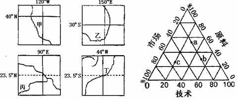 5、单选题 下面左图是四幅世界区域轮廓图,右图为三类工业的区位因素三角结构图。