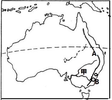 本题解析:(1)甲位于澳大利亚的东南部,为墨累—达令盆地;A位于澳大利亚东部,为大分水岭;B为澳大利亚的首都,为堪培拉。(2)甲地的墨累—达令盆地为世界著名的混合农业区。我国珠三角的基塘农业是种植业和养殖业的结合,属于混合农业。而坝子农业、河谷农业、灌溉农业都属于种植业。(3)澳大利亚混合农业是种植业和养殖业共同发展,可因市场的变化而灵活选择农业生产类型,正确;在混合农场里种植业和养殖业相互促进,形成良性的农业生态系统,B项正确;该地的混合农业,生产规模大,投入的劳动力少,C、E错误。
