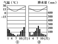 (2)下图能反映甲图中P地气候的是________,该气候与美国东南部气候类型相同,但该气候在甲图中的分布面积远小于美国东南部,试从影响气候的诸因素方面对此现象进行解释。(4分)