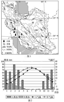 2、综合题 (22分)图1为某国等高线地形图,图2是图1中A、B两地的气候资料统计图,读图,回答下列问题。