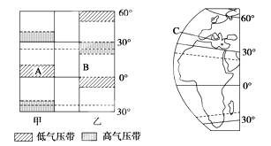 (1)读图,A气压带位于赤道附近,是赤道低气压带。受其控制地区的气候特征为终年高温多雨。